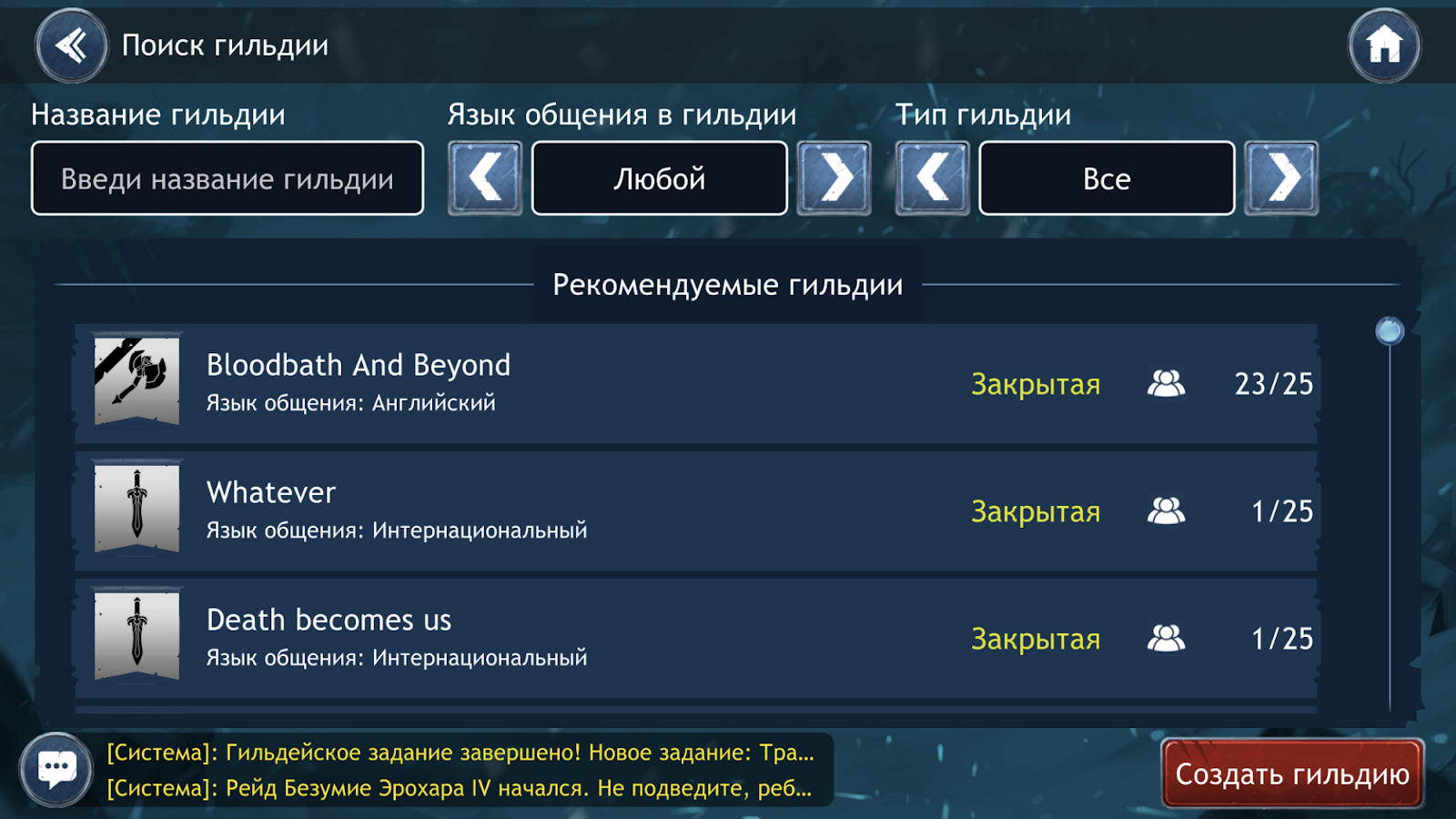 О: Прямо в игре в меню Гильдии. Кроме того, лидеры и офицеры гильдии часто ищут новых участников во внутриигровом чате. А еще можно присоединиться к нашему серверу в Discord, там есть специальные каналы, посвященные поиску гильдий и рекрутов.